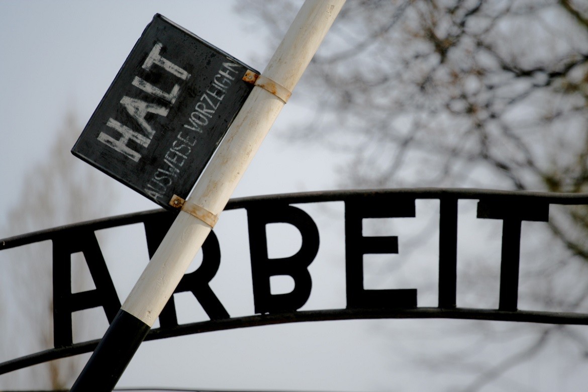 现在,让我们走进这座集中营,近距离地了解一下这座曾经吞噬无数生命的人间炼狱。来到这里,最开始见到的是奥斯维辛一号营地的大门。铁丝网建造的大门上,颇为讽刺地写着一句德语“ARBEIT MACHT FREI”,意思是:劳动使人自由。