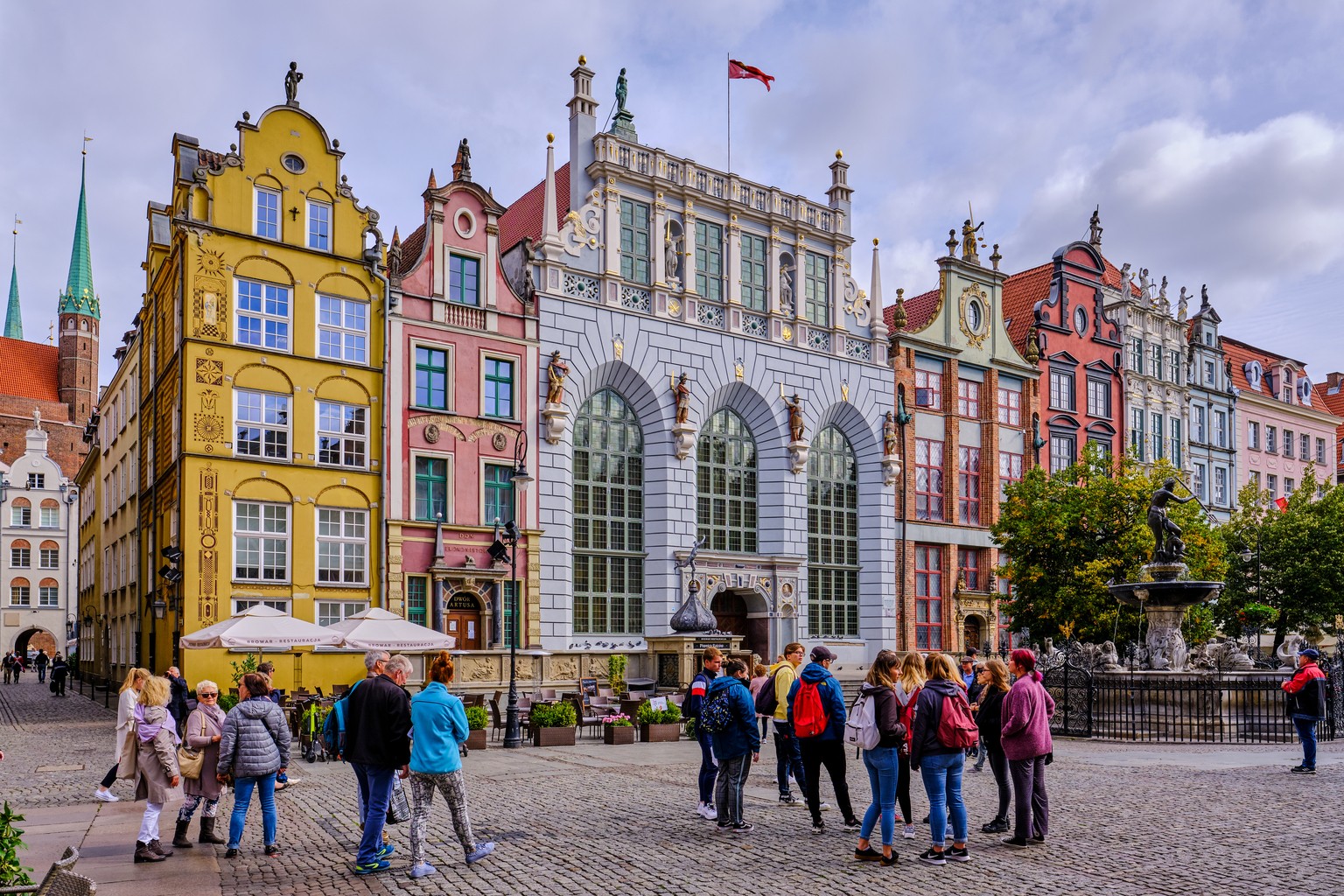自1633年以来,海神喷泉(Fontanna Neptuna)一直矗立在亚瑟宫前,被视为格但斯克的象征。它是在市长巴尔托梅伊·沙赫曼(Bartłomiej Schachmann)和市政委员会的倡议下建造的。喷泉雕塑以海王涅普顿为原型,由阿伯拉罕·范登·布洛克(Abraham van den Blocke)设计,1615年由皮特·胡森和约翰·洛格在奥格斯堡用青铜铸造而成。18世纪下半叶,喷泉底座以洛可可风格进行了翻修,并增加了大量的海洋生物装饰。把一枚硬币扔进喷泉,命运便会让你与格但斯克重逢。